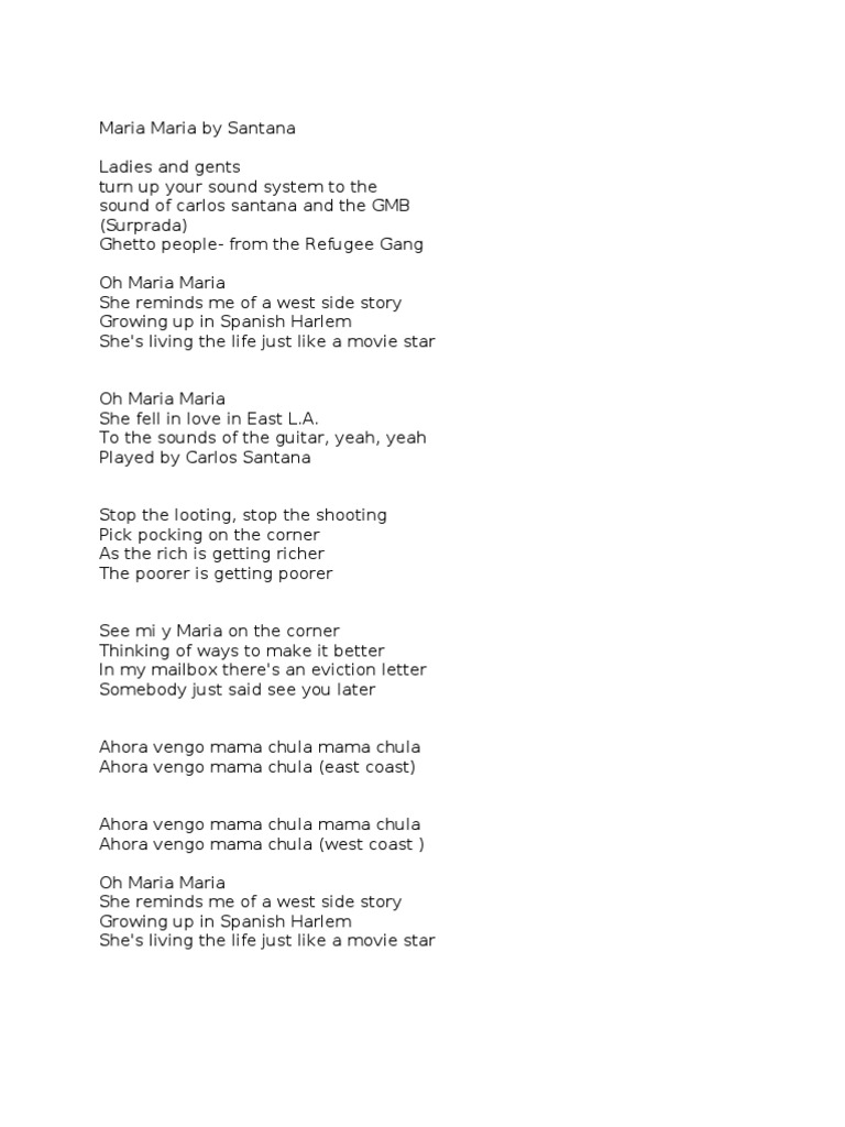 Wyclef jean, carlos santana, jerry duplessis, david mcrae, karl perazzo, marvin hough, paul rekow. Watch the video for maria maria from santana's the essential santana (disc 1) for free, and see the artwork, lyrics and similar artists. Print or download pdf of the rock score. To the sounds of the guitar, yeah played by carlos santana.